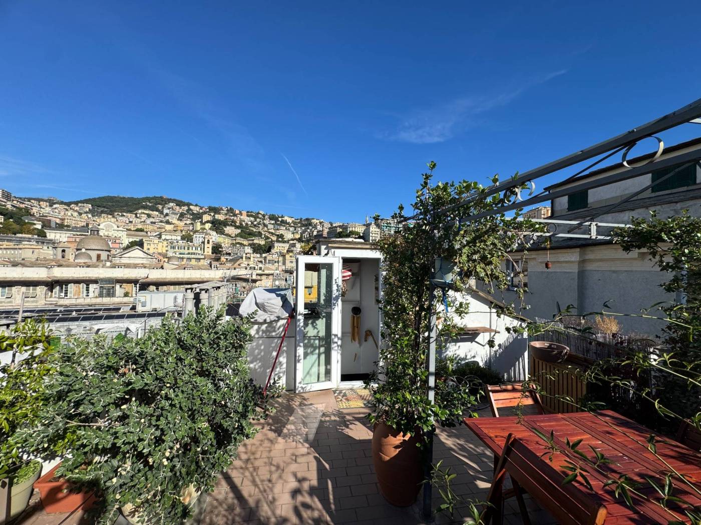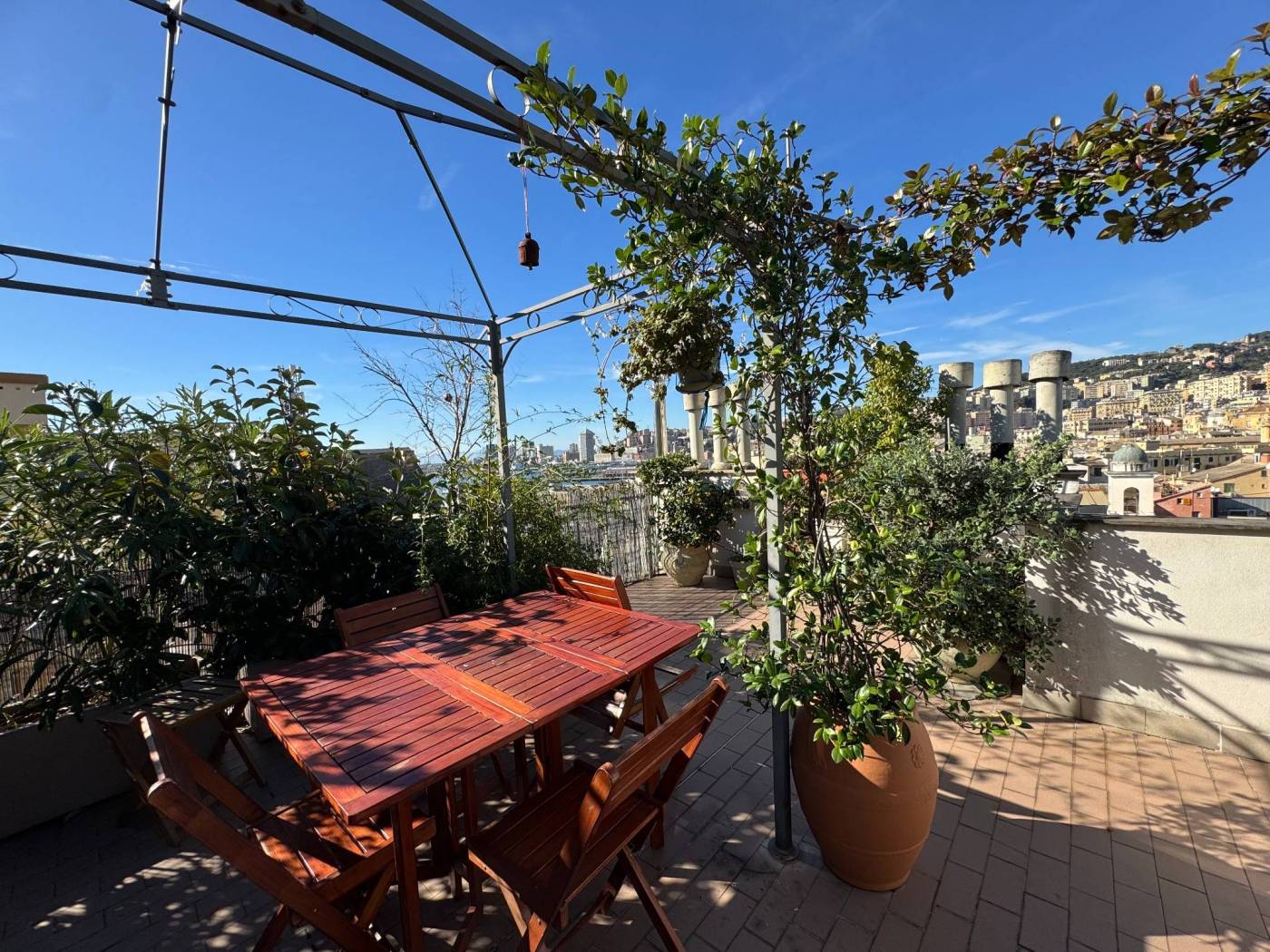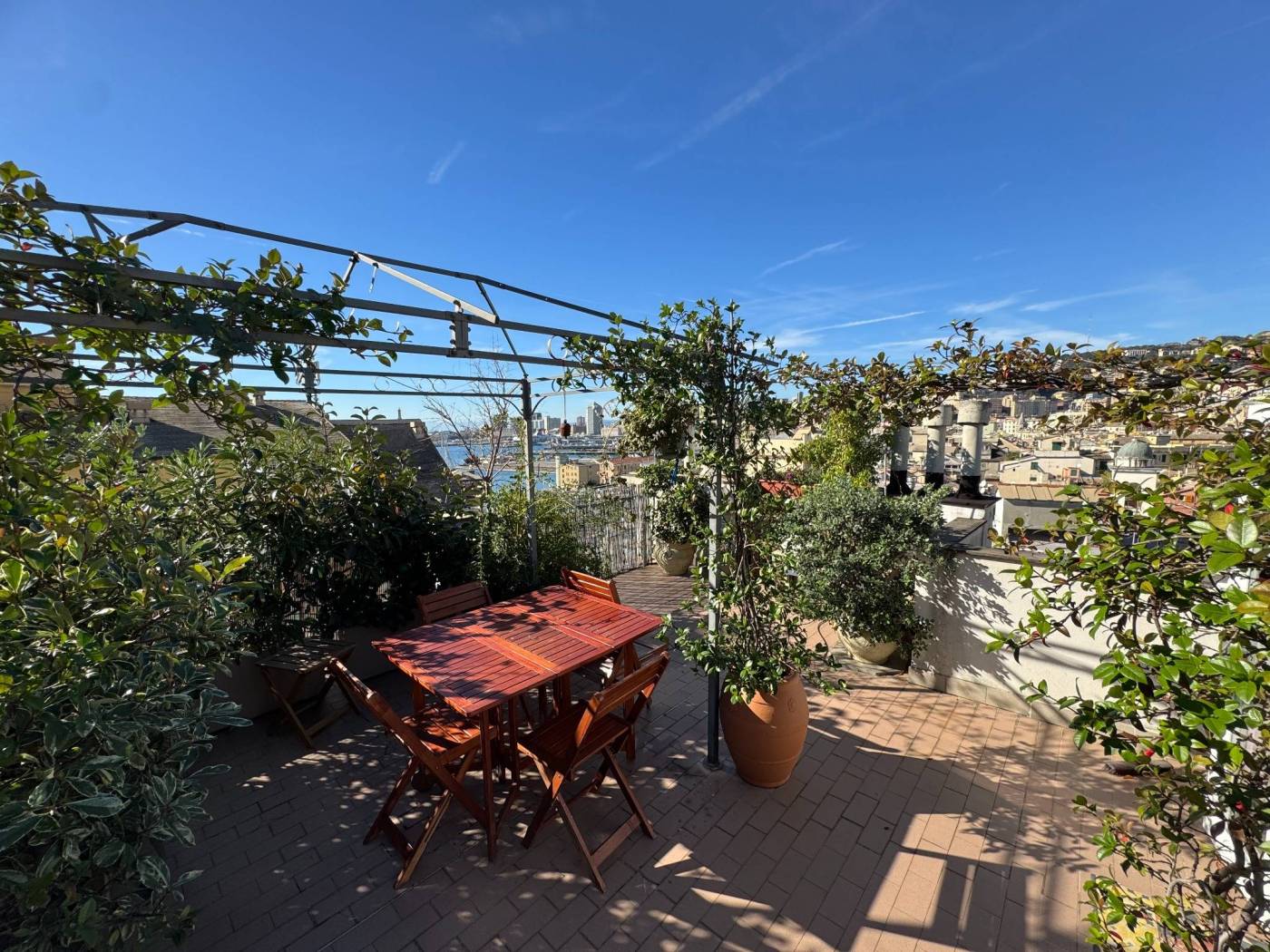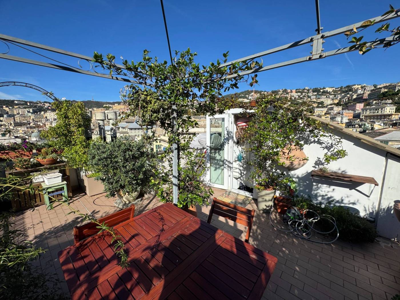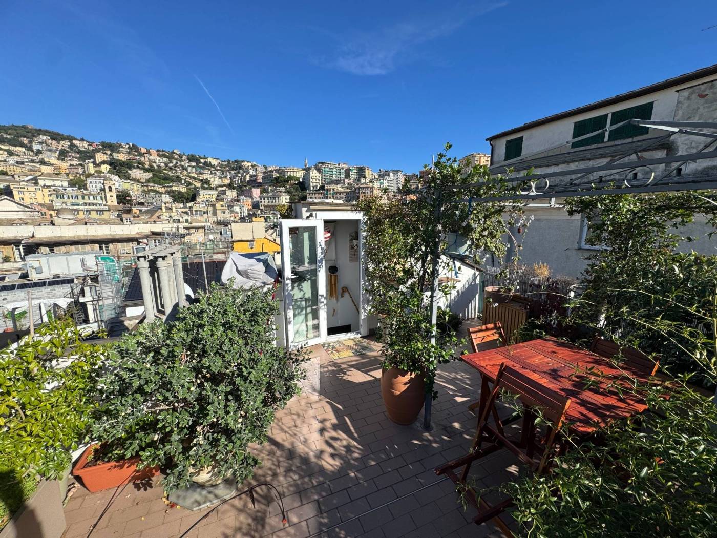 The absence of an elevator, typical of historic residences in the area, is more than compensated by the exceptional natural light, the southern exposure, and the authentic character of the property. Fully renovated, the apartment is arranged over multiple levels: from the entrance, a few steps lead to two bedrooms and a spacious double living room, originally used as a third bedroom. The upper level hosts the kitchen and the bathroom, both completely refurbished. On the top level, the property features a splendid private terrace, the true highlight of the home, open on multiple sides and equipped with a green area, lighting, and an irrigation system, offering open views over the city.