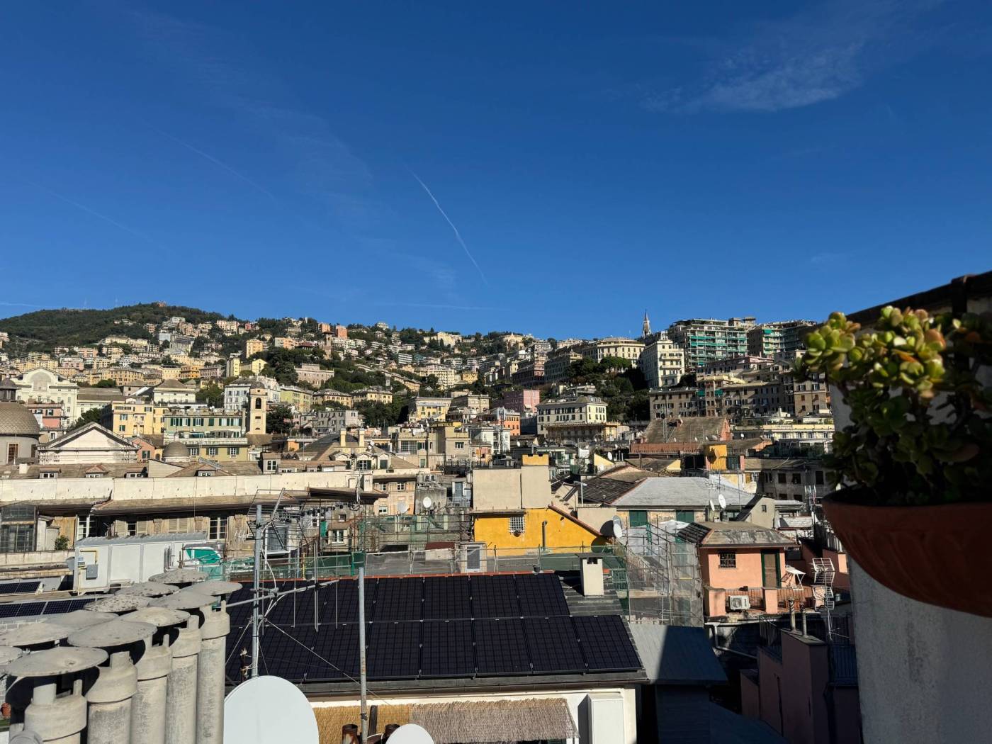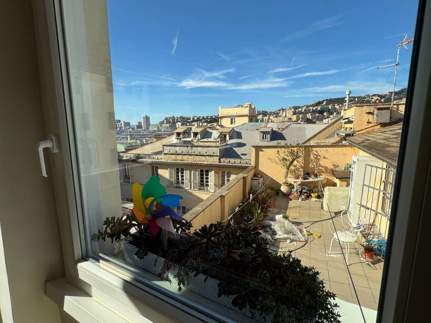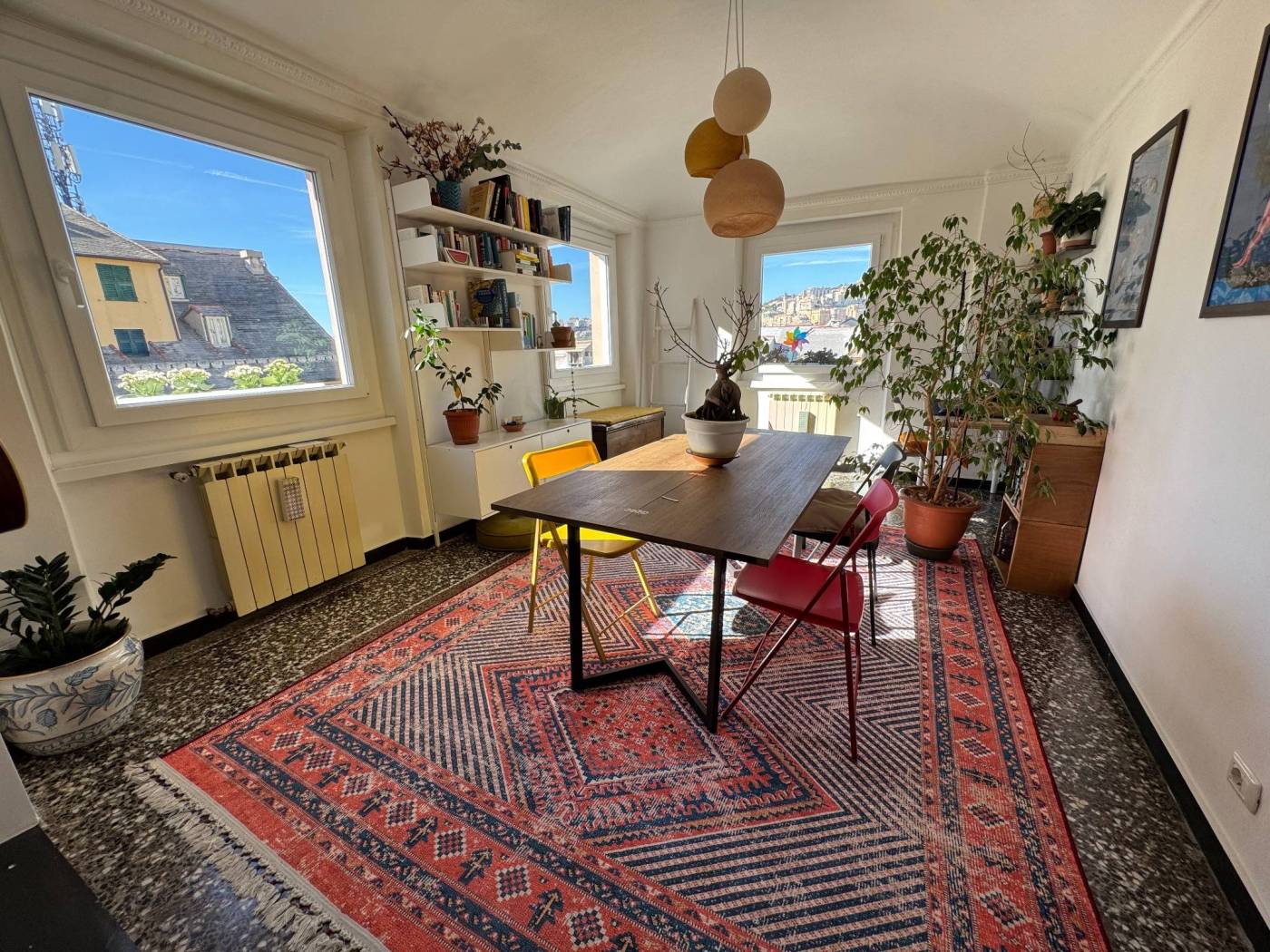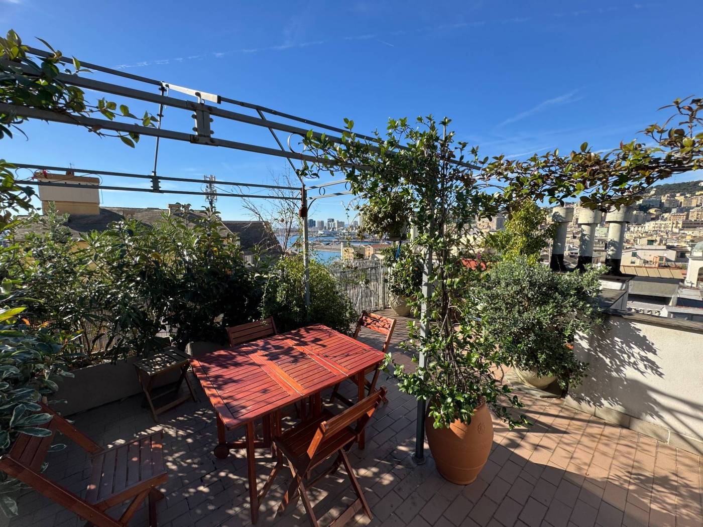 The absence of an elevator, typical of historic residences in the area, is more than compensated by the exceptional natural light, the southern exposure, and the authentic character of the property. Fully renovated, the apartment is arranged over multiple levels: from the entrance, a few steps lead to two bedrooms and a spacious double living room, originally used as a third bedroom. The upper level hosts the kitchen and the bathroom, both completely refurbished. On the top level, the property features a splendid private terrace, the true highlight of the home, open on multiple sides and equipped with a green area, lighting, and an irrigation system, offering open views over the city.
